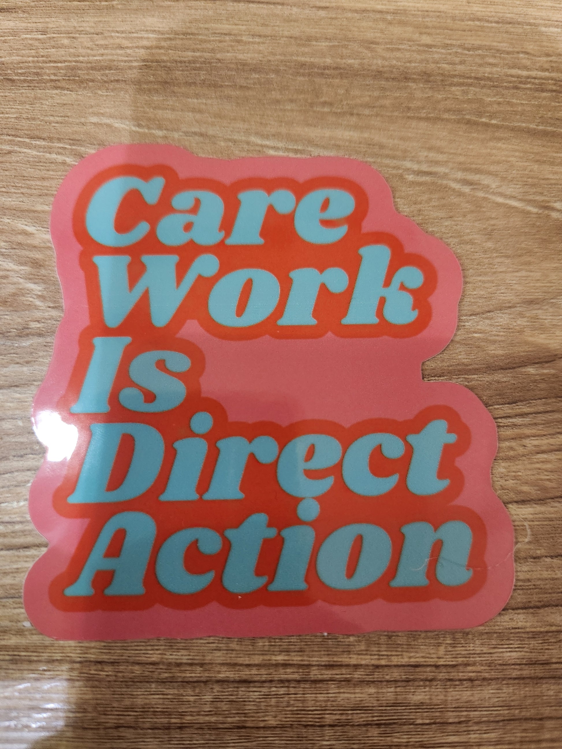 Dye cut sticker. The words are care work is direct action. The background is light pink. The words are light blue with darker pink tracing around.