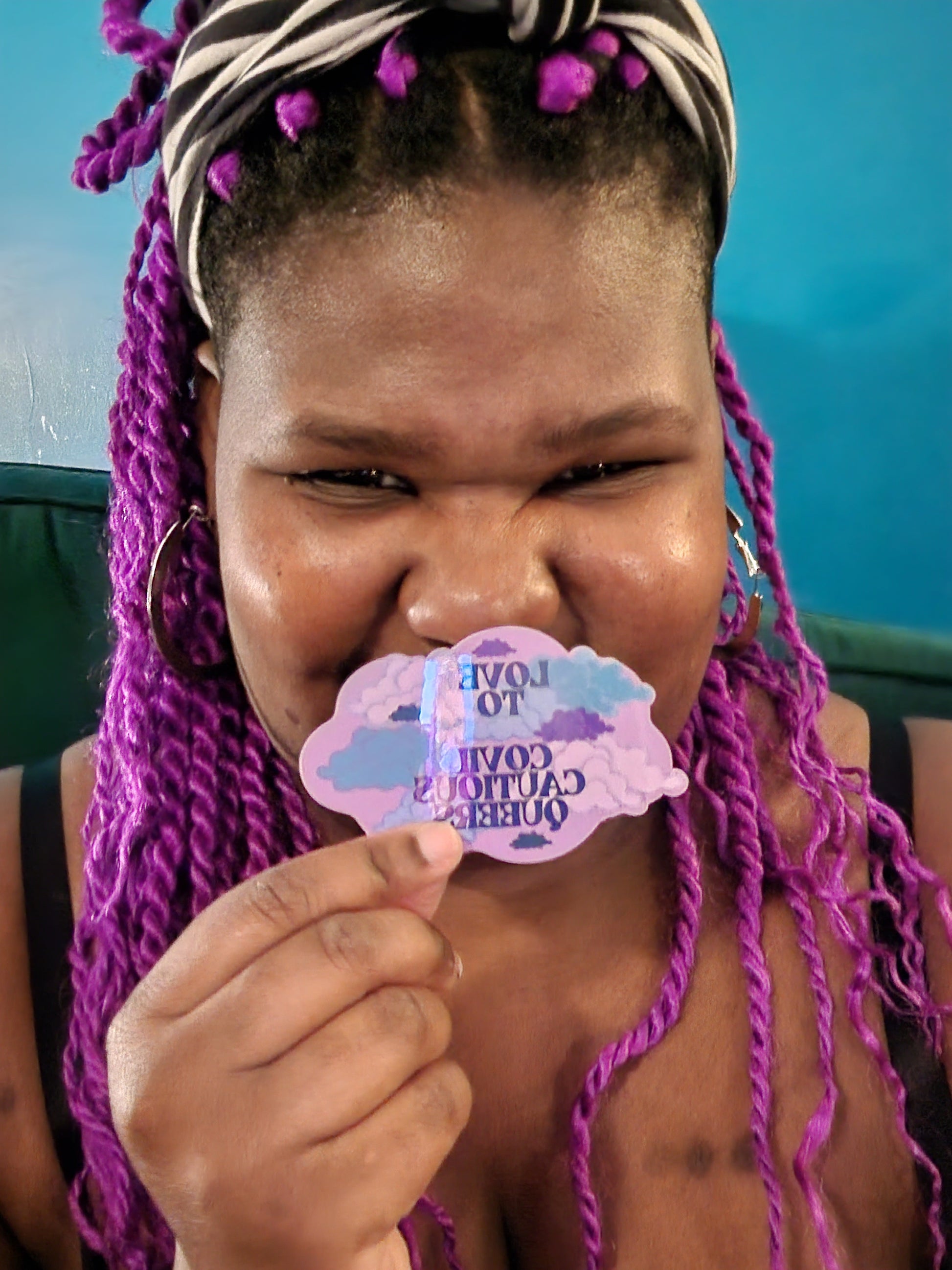 A sticker that is shaped like a cloud up top and on the sides and the bottom is flat. It is light purple/lavender. In blue words it says "Love to Covid Cautious Queers " behind and around the words are different shades of light blue and lighter purple clouds.