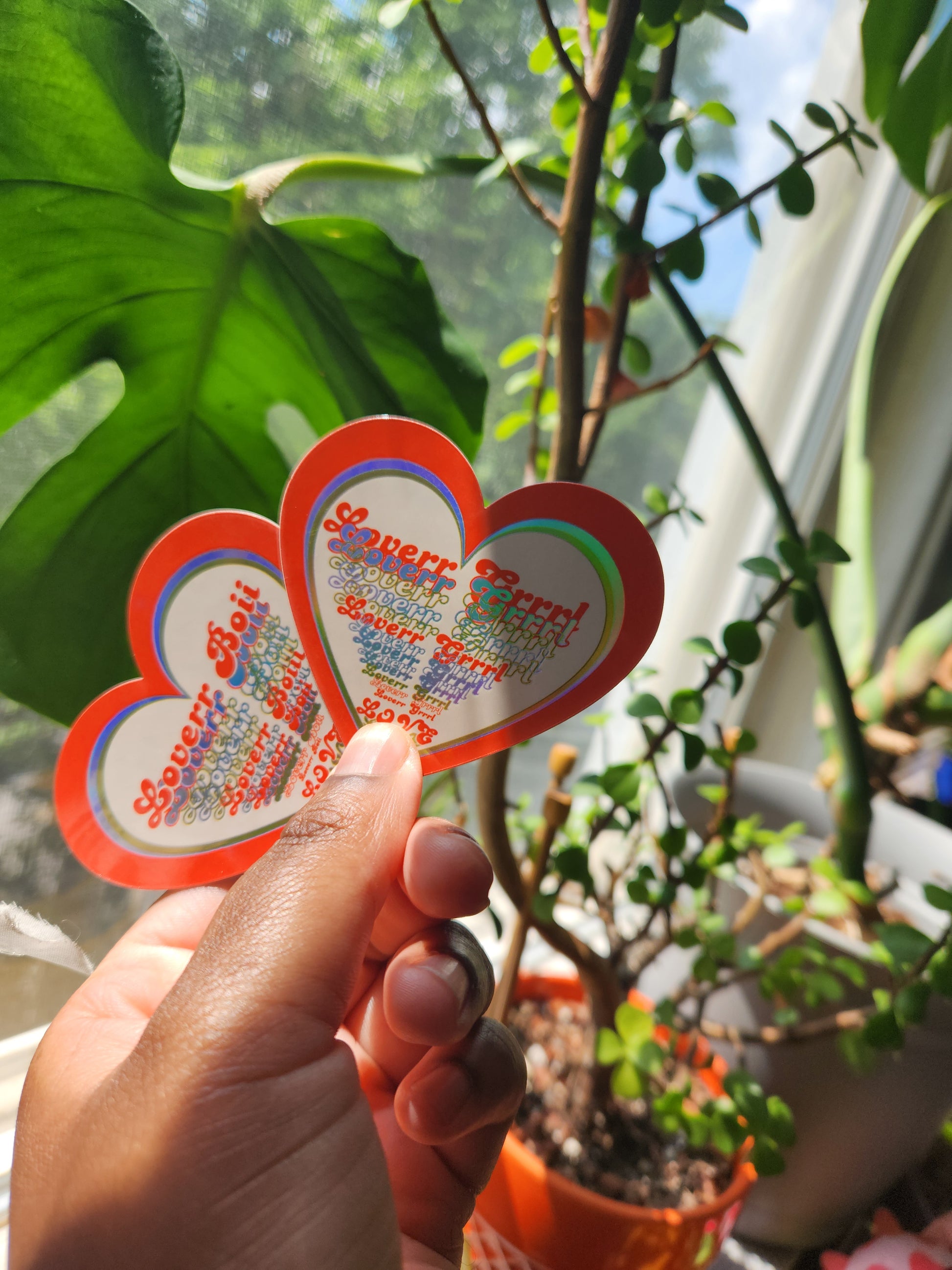 A heart shape sticker that is beige then green then lavender then red. In the center is the words "Lover Grrrl" over an over. Its vinyl and holographic