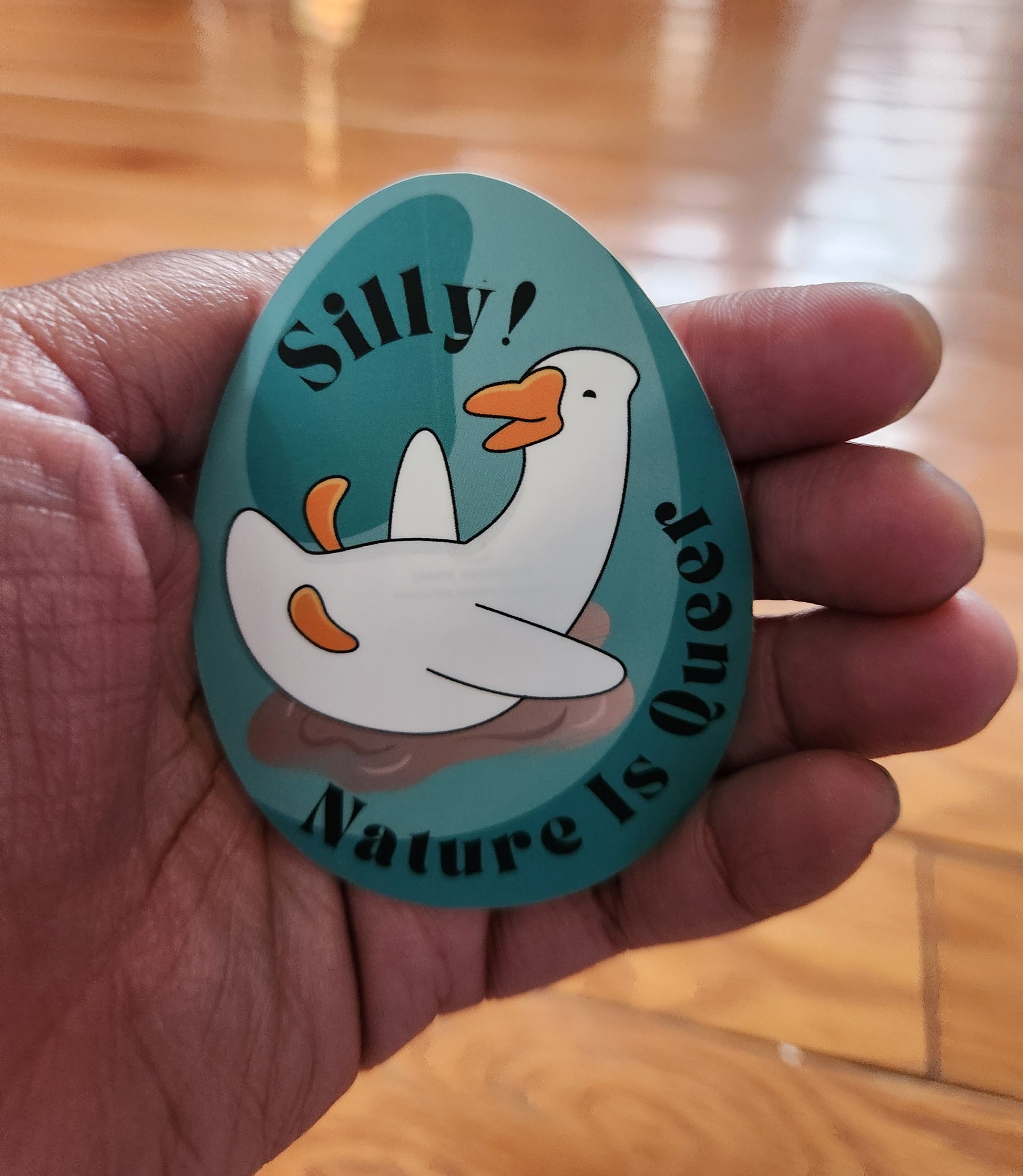A blue oval sticker. That says "Silly!" in Black at the top. and "Nature is Queer" in black at the bottom right.