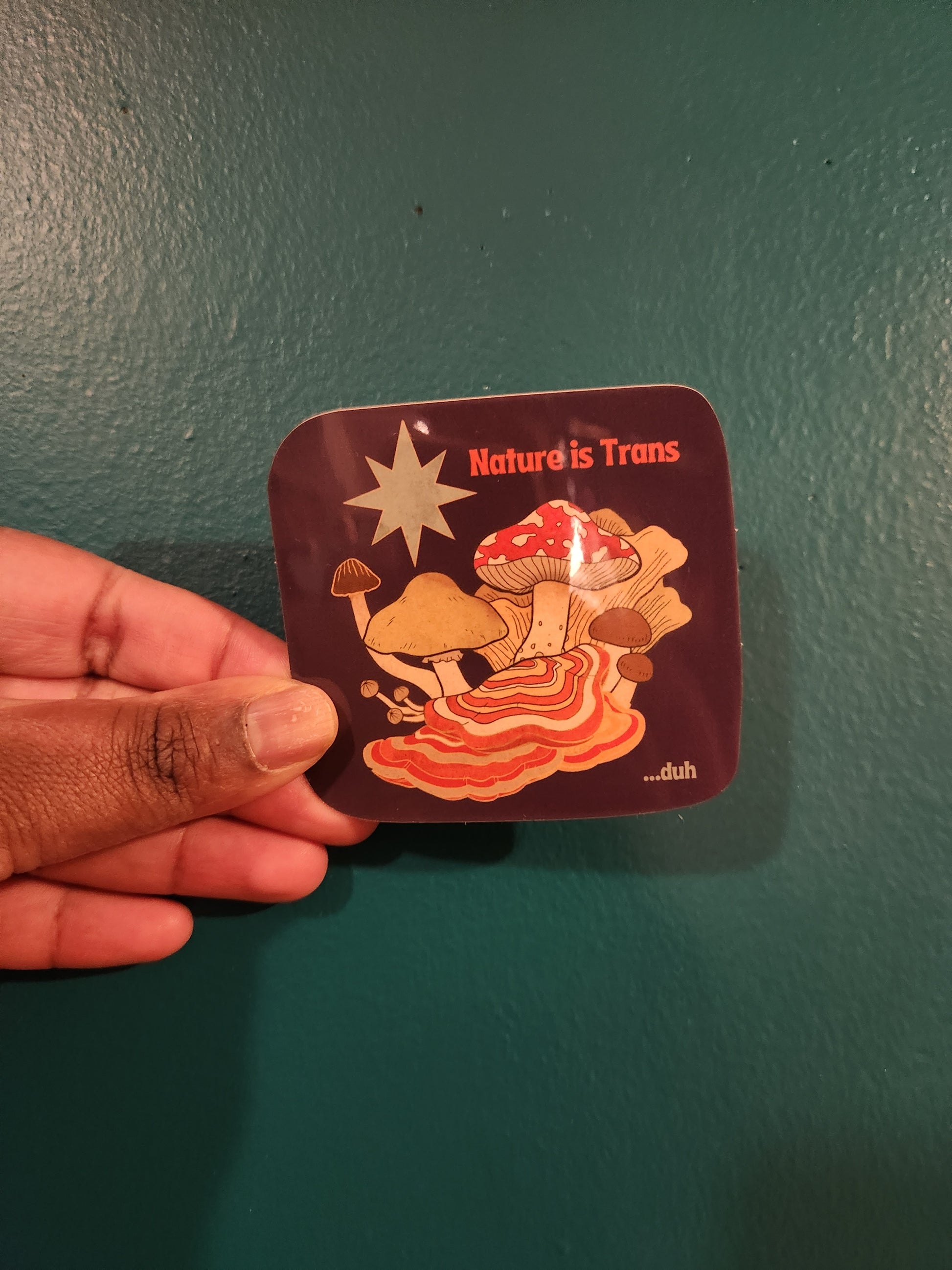 A purple rounded square sticker. That says "Nature is Trans" in orange at the top.right and "duh" in blue at the bottom right.