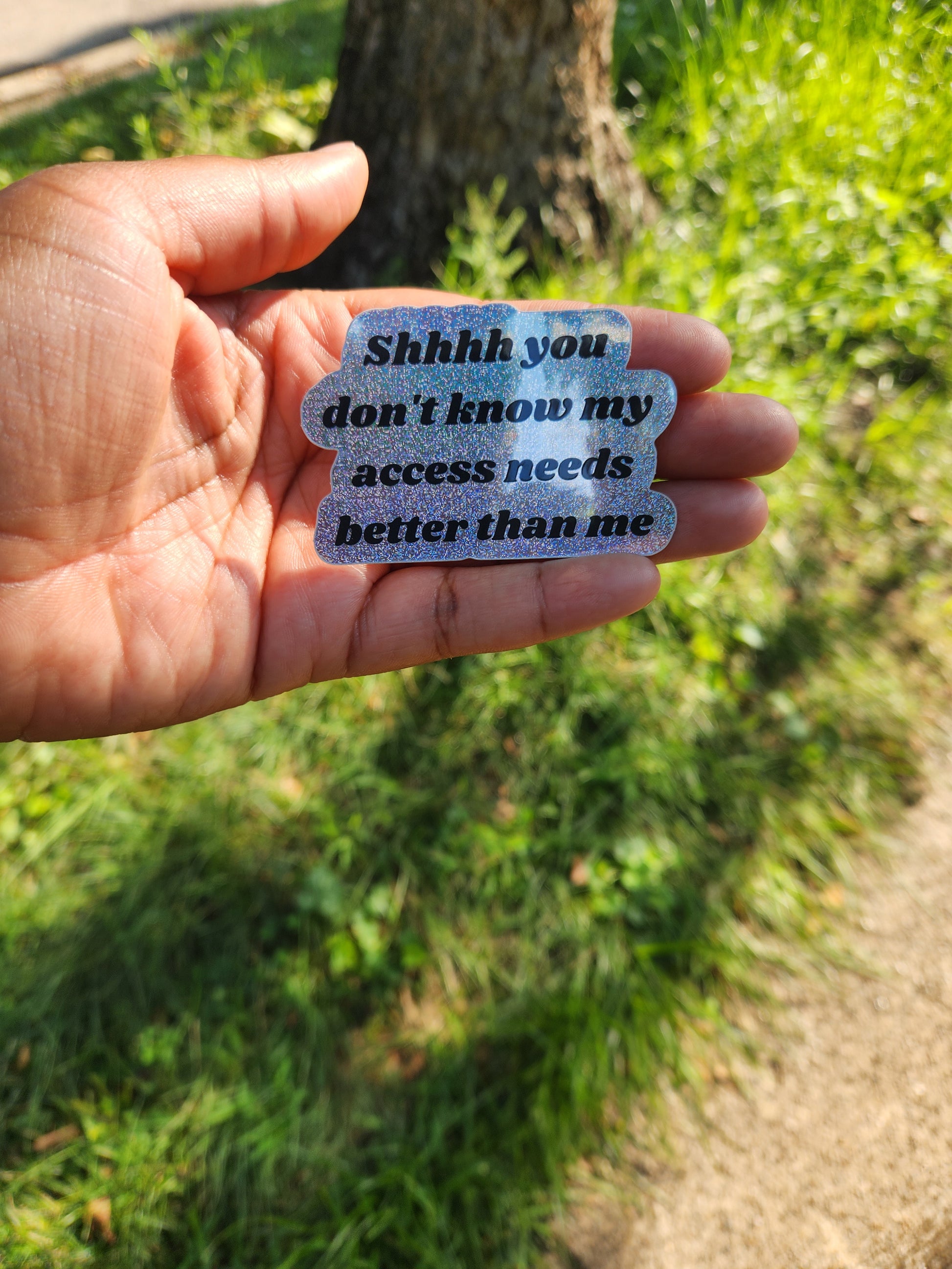 * Die cut sparkle sticker that says : shhhhh you don't know my access needs in black text